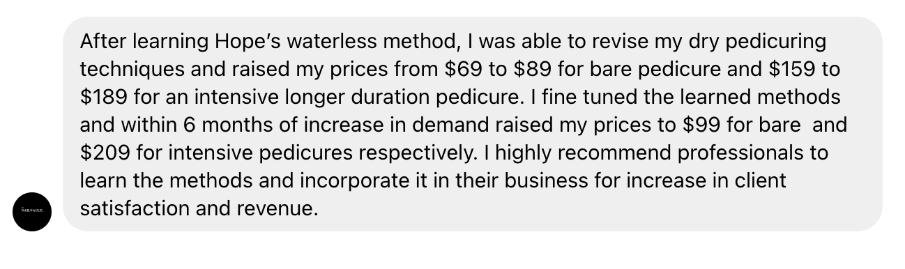 This course touched on very important safety concerns that are very normalized in the nail industry and why we should avoid them. This really separated Hopes education from the rest. This course really sets us up to not only provide an effective waterless pedicure but to also educate our clients for best results to work towards healthy feet."